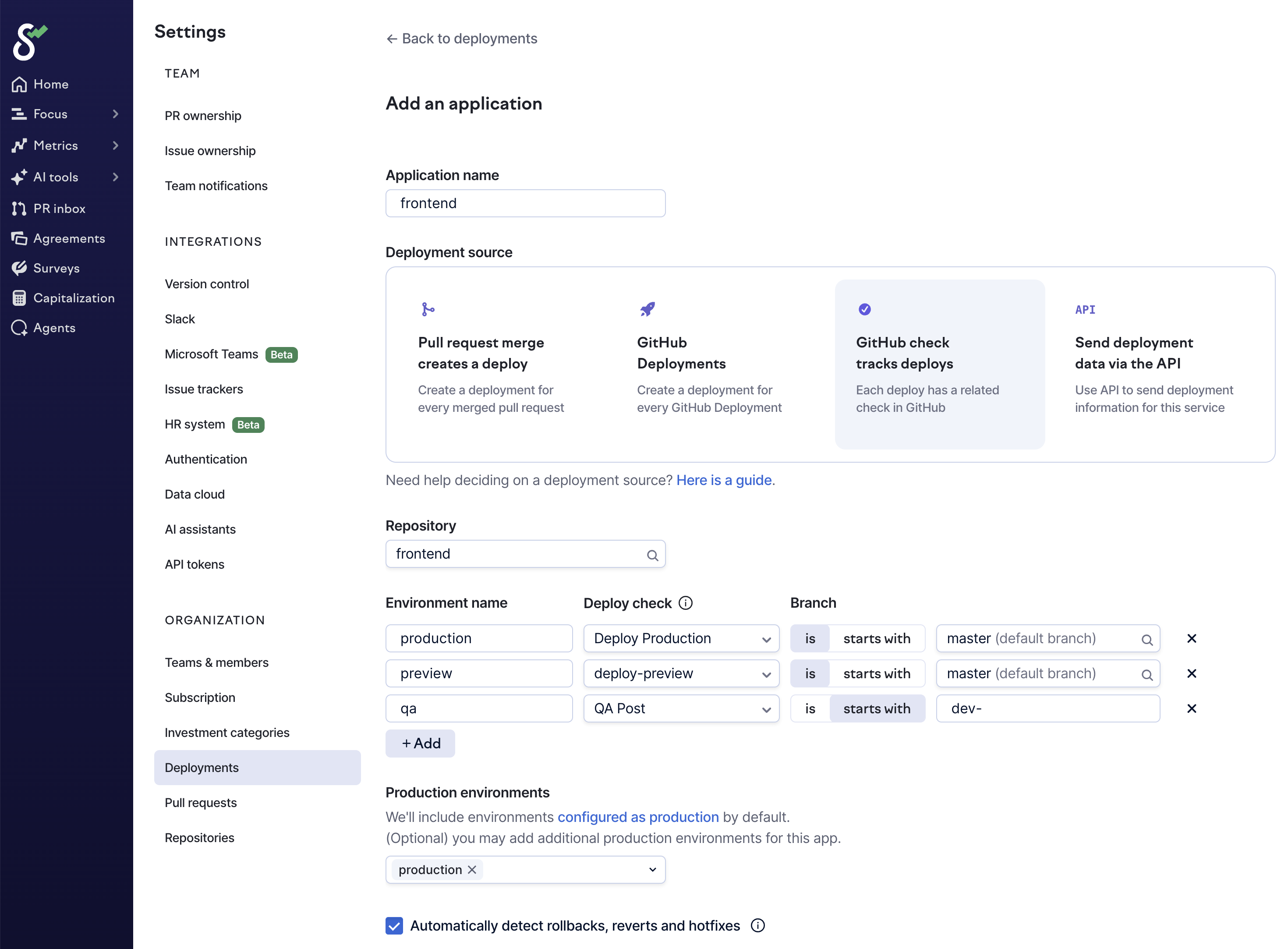 5. *Optional:* Add more environments based on the check and the branch name or prefix. This allows you to view deployments from different environments on the [Metrics → DORA → Deployments](https://app.swarmia.com/metrics/dora/deployments) page.