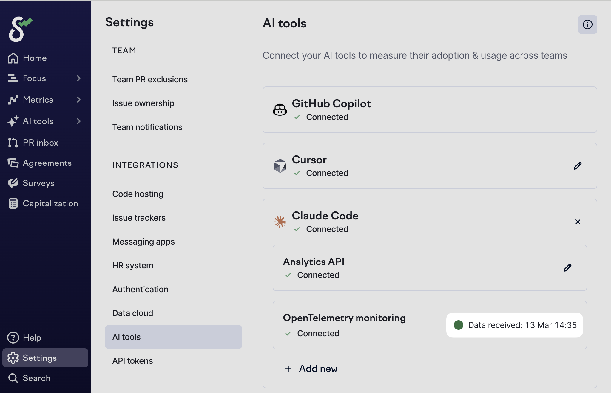 The timestamp in [Settings → AI tools → Claude Code → OpenTelemetry monitoring](https://app.swarmia.com/settings/ai-assistants) shows the latest event Swarmia has received in real time. The AI tool metrics are calculated from the events once a day, so it can take up to 24 hours for the data to become visible.