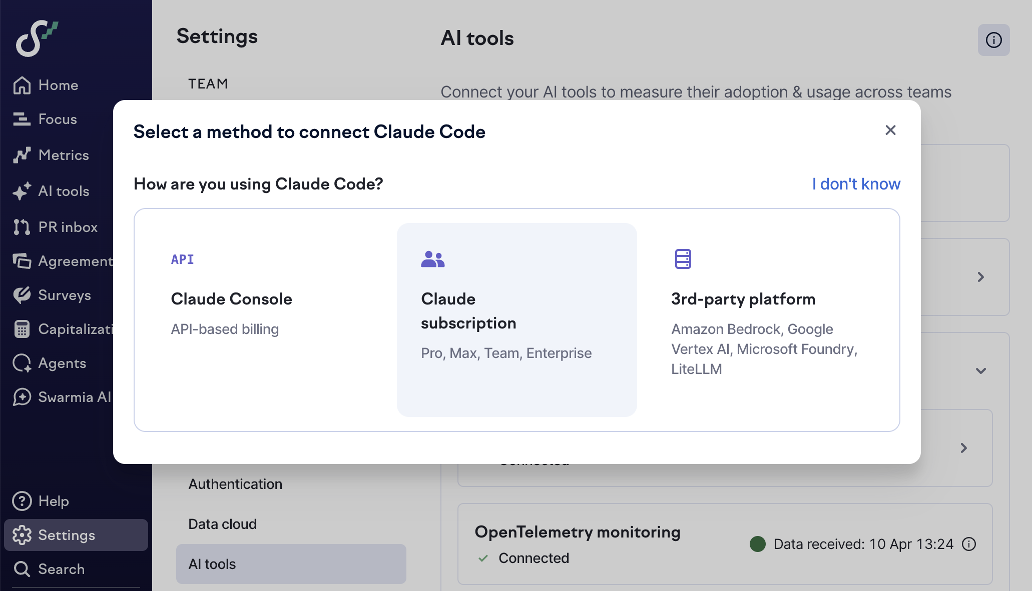 There are multiple ways to run Claude Code, each with a different set of supported integration options for getting your data into Swarmia. For a quick overview of the options and compatibility, see the table below. You can just go to [Settings → AI tools → Claude Code](https://app.swarmia.com/settings/ai-assistants), click "Add new", and Swarmia guides you through the setup.