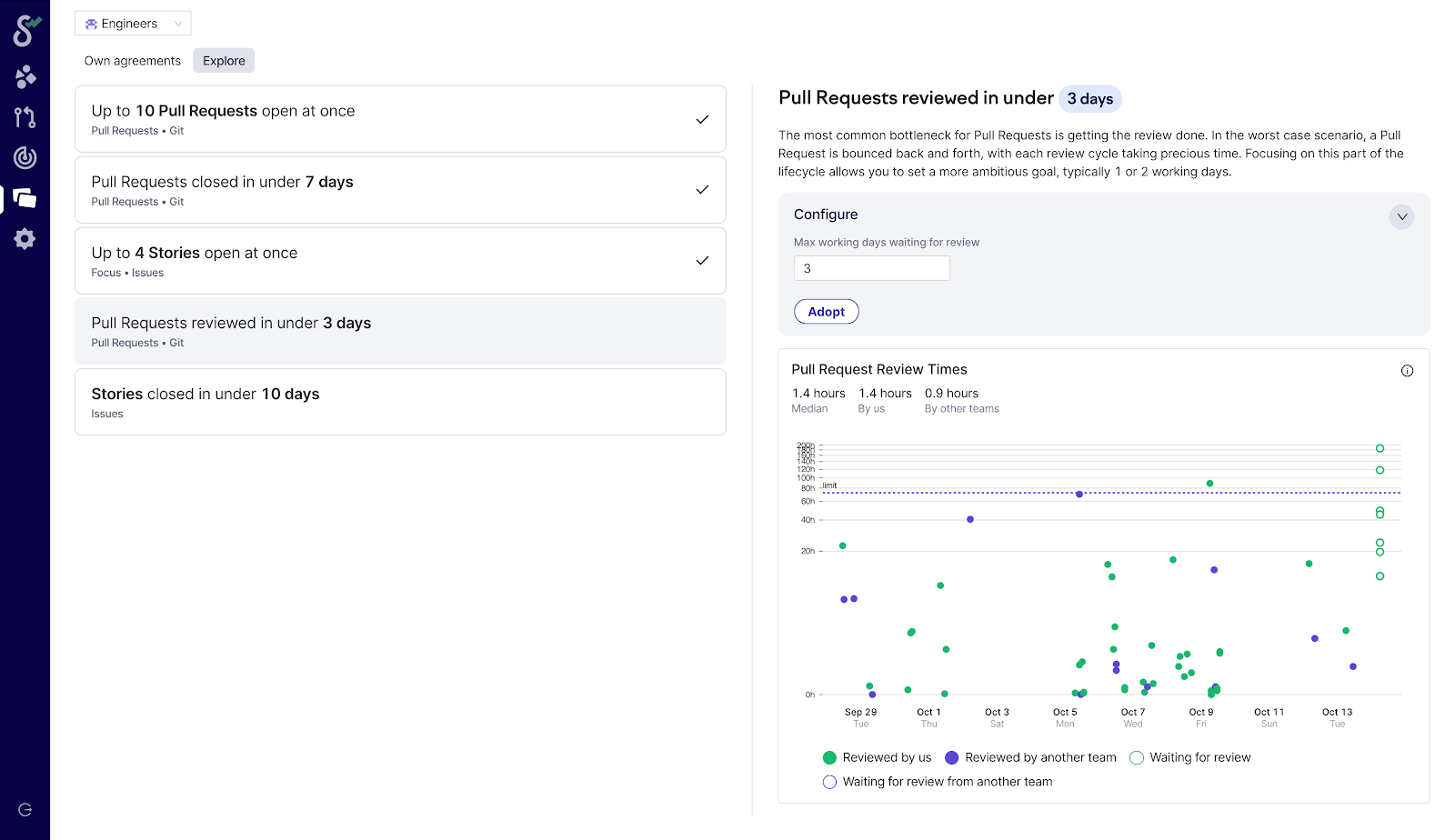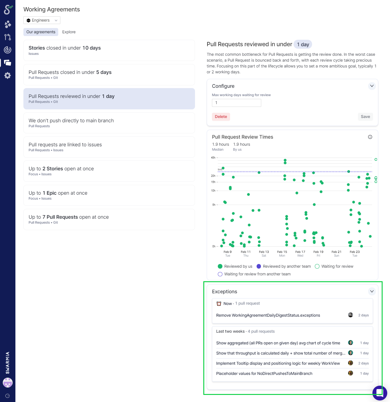 To get started with improving your code review time, head over to [Working Agreements](https://app.swarmia.com/working-agreements) and adopt a new agreement to review pull requests within a few working days, according to the analysis you’ve just made.