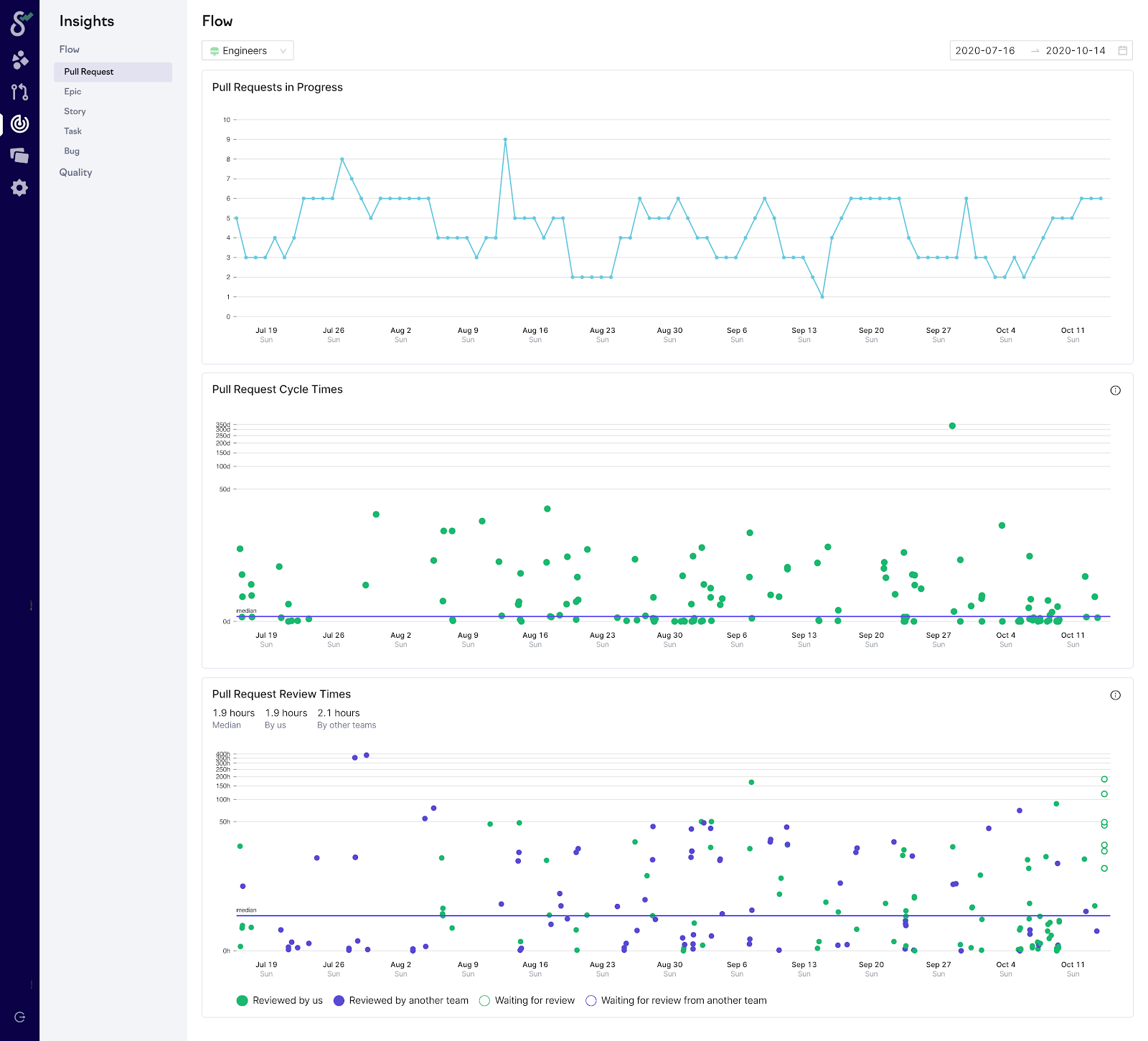 [Flow Insights](https://app.swarmia.com/insights/flow/pull-requests) is a good way to take a look at the pull request conundrum over a longer period. By reviewing past work in progress and cycle times, you can spot trends and begin to estimate realistic targets for future throughput. Importantly, pull request review time is often a reliable leading indicator of total cycle time.