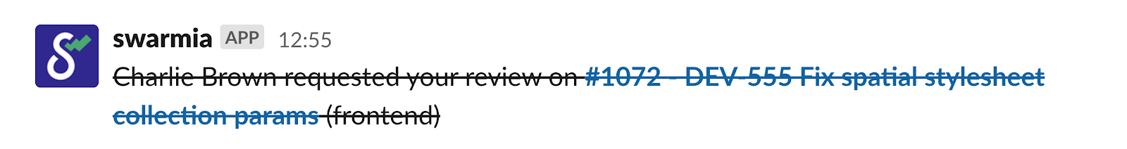 To avoid redundant notifications, the original message is simply struck through after the review is completed and the pull request is merged.