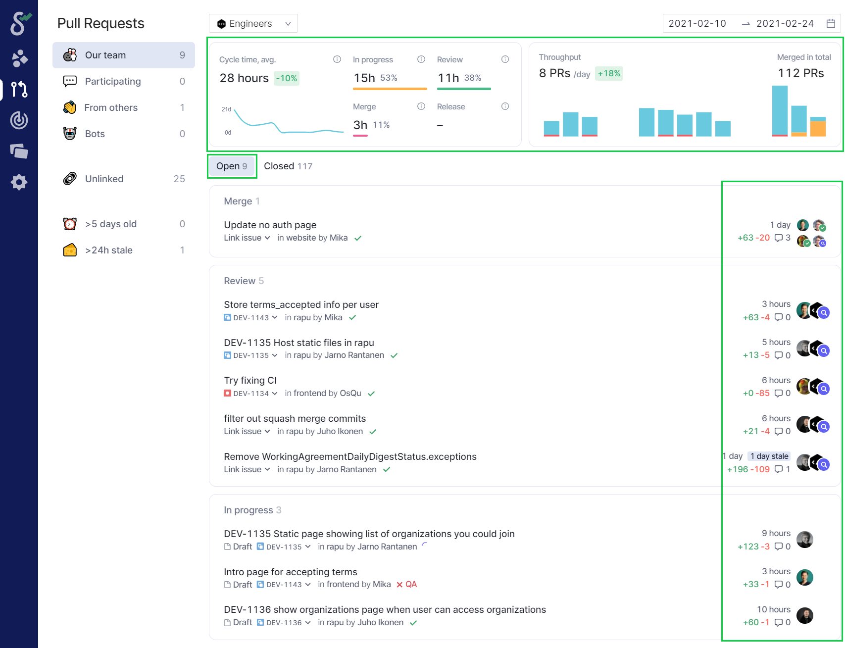 The above Pull Request view tells you a lot about your situation. A large number of pull requests in progress is often a sign of a problem, and being able to see pull request ages helps you to understand its magnitude. The graphs above your pull request inbox give insights about cycle time and pull request throughput trends over time.