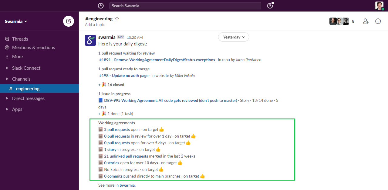 Despite increased visibility, delays in reviews are bound to happen. To catch problems as they occur, set up the daily Slack or Microsoft Teams digest for your team to understand what’s in progress and which pull requests need attention, and get timely feedback about working agreements that are slipping.