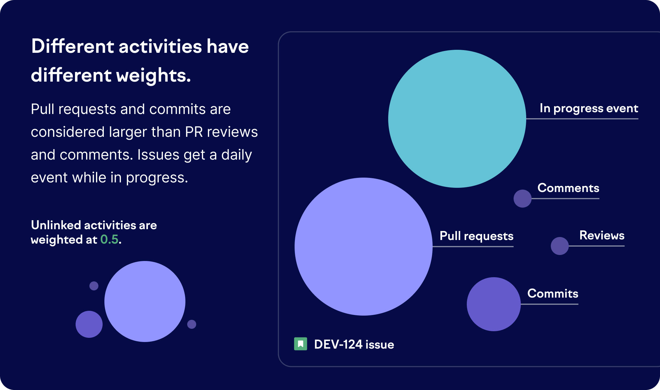 Activities are weighted differently, with pull requests and commits counted more heavily than reviews and comments.