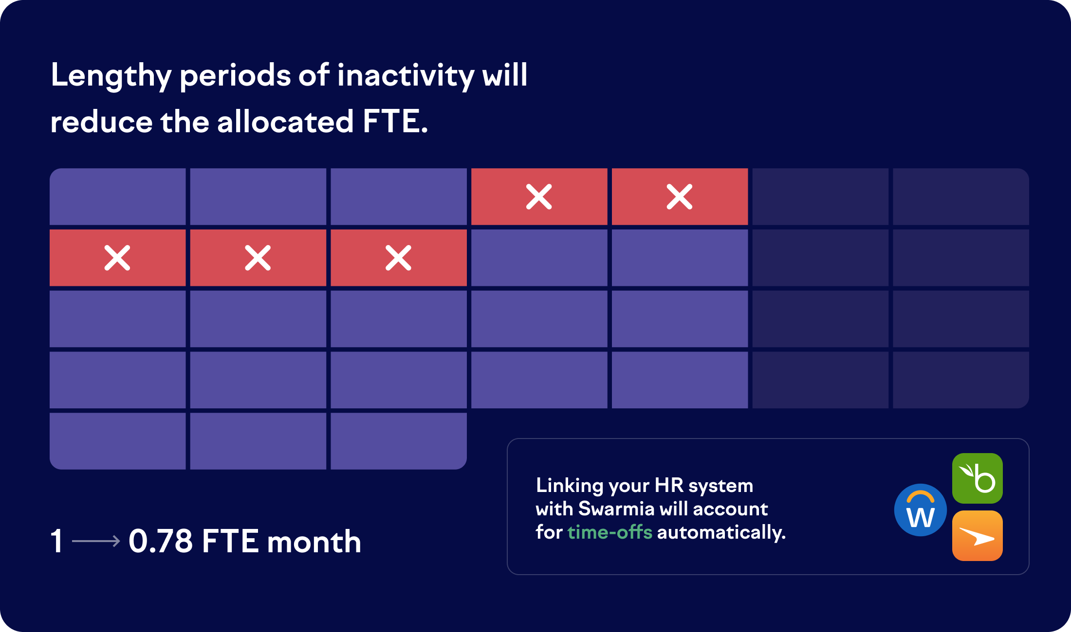 We adjust the allocated FTE for extended periods of inactivity and, if your HR system is connected with Swarmia, for logged time off periods.