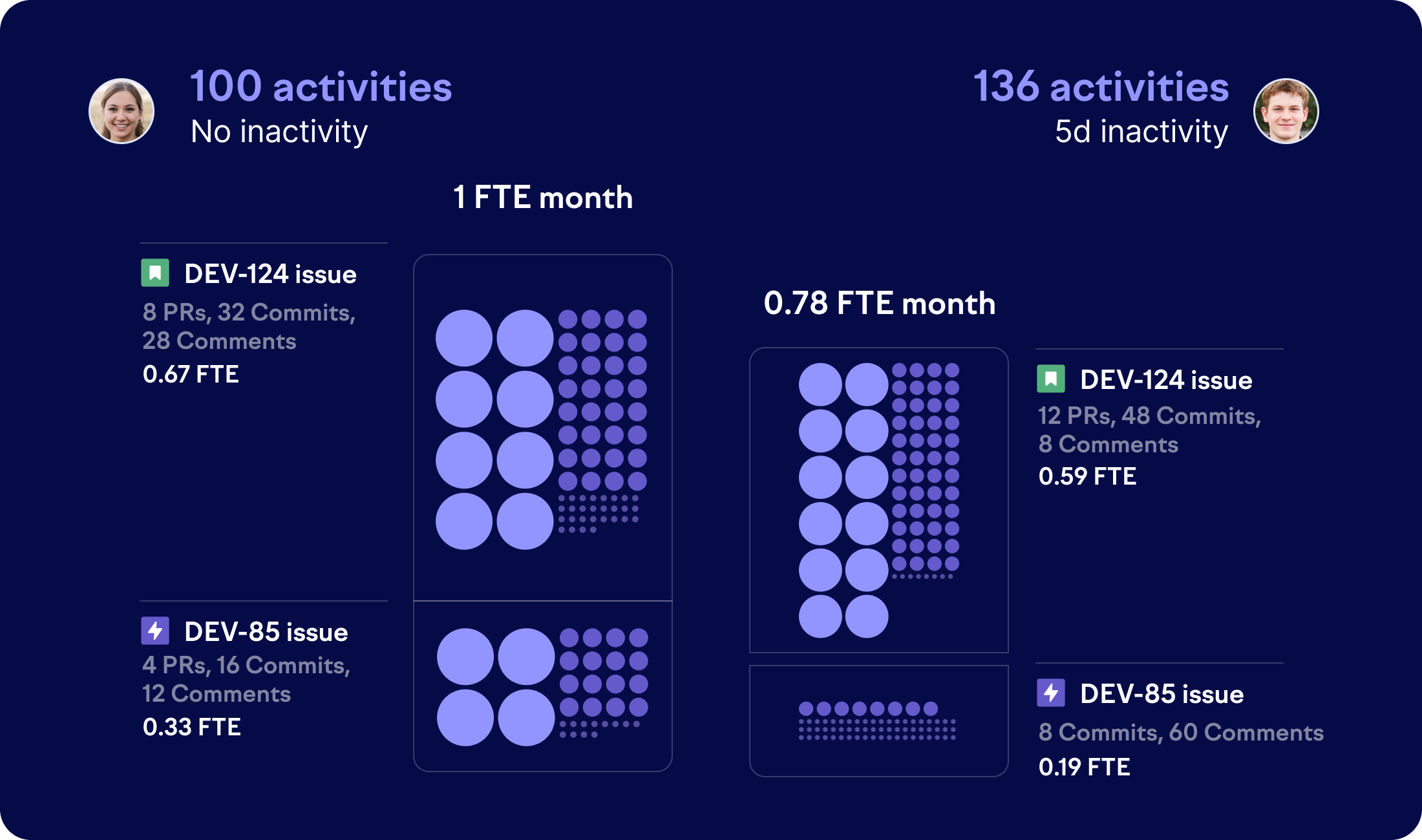 As an additional safeguard, Swarmia automatically reduces available FTE when contributors are inactive for extended periods, treating it similarly to time off. If someone has no activity for more than 7 days (5 business days), that period is deducted from their monthly FTE allocation.