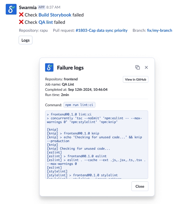 You can also get a notification on failed CI checks and view the failure logs directly in Slack (Microsoft Teams coming soon).