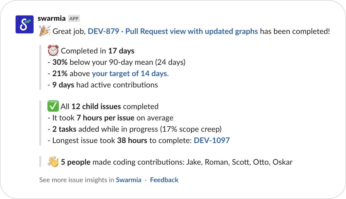 When complete a larger issue (epics or stories), you'll get a notification to your team's Slack channel.