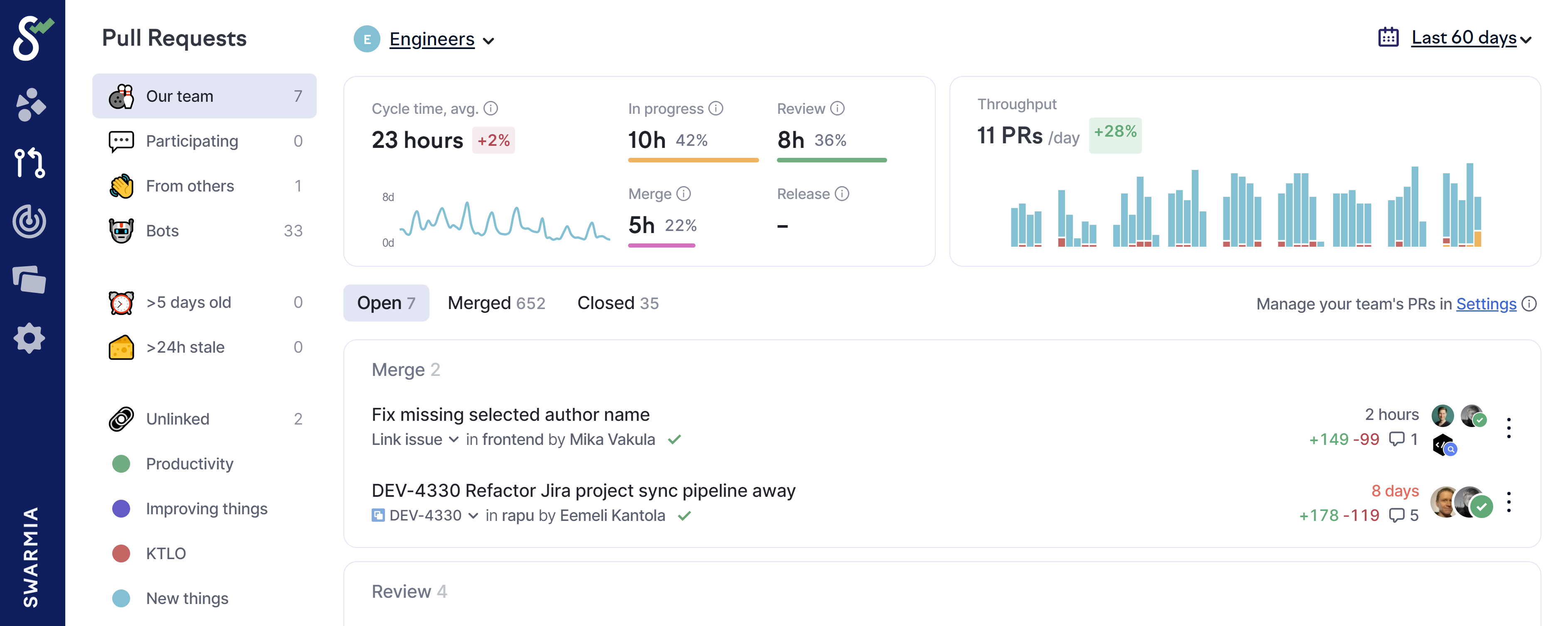 With GitHub, it is surprisingly difficult to see all open pull requests and where they are going in a team context. Especially when you are working in an environment with multiple repositories and lots of cross-team collaboration, it can be easy for pull requests to fall through the cracks. [The Pull Request view](https://app.swarmia.com/pull-requests/our-team) in Swarmia works in real-time and helps teams manage their pull requests in progress, make sure they are moving forward swiftly, and ensure no pull request is forgotten.