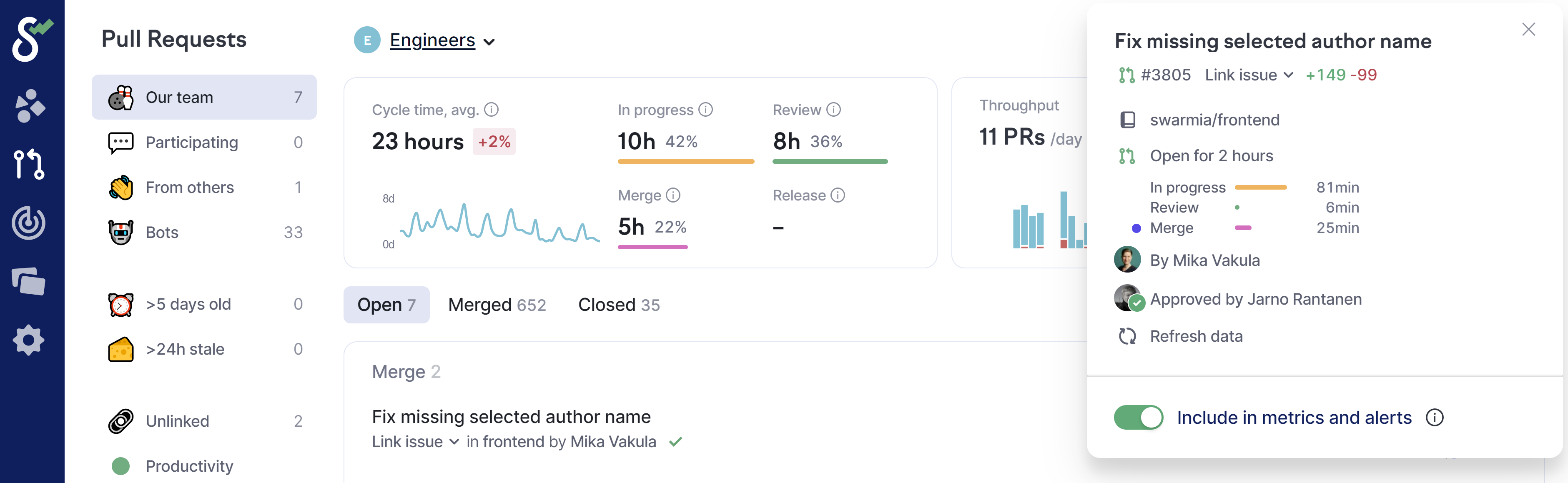 If you feel like particular pull requests should rather be excluded from the metrics and alerts in Swarmia, you can switch the toggle for any pull request to exclude it from the metrics.