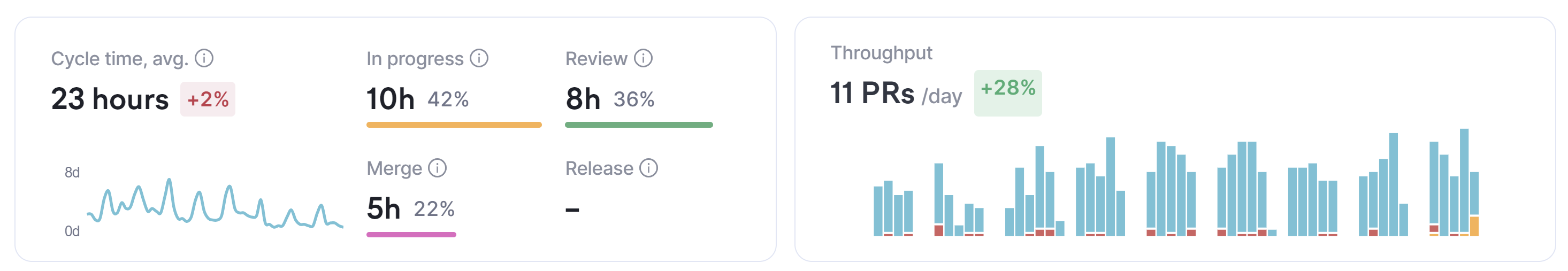 The cycle time graph shows you how long, on average, it takes for pull requests to take from the first commit to be merged. You will also see the split between how long pull requests on average spent in progress versus in review versus merge phase based on the activity in GitHub. Pull Requests move into the "review" state when a review is requested in GitHub and again to the "merge" state when approved.