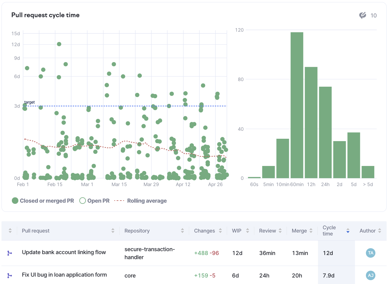 *Cycle time distribution chart* (on the right) shows what portion of pull requests takes longer than expected to complete, and individual pull requests are shown in the scatter plot on the left. Pull requests far above the rolling average line need special attention — it's the code that's been waiting for the longest to be delivered.