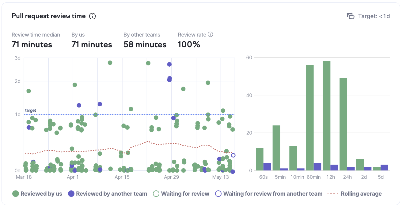 *Review time* is another important contributing factor to cycle time. Sorting the table by review time helps to identify pull requests that spent the longest in review — or were merged without review at all. The number of pull requests merged without review is reflected in the *review rate* above the chart.