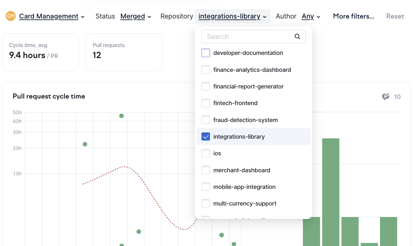 Filter the *pull request view* by status, repository, or author (by clicking the filters next to the team name) to identify problematic pull requests. Filters are applied to the table as well as the charts above it.